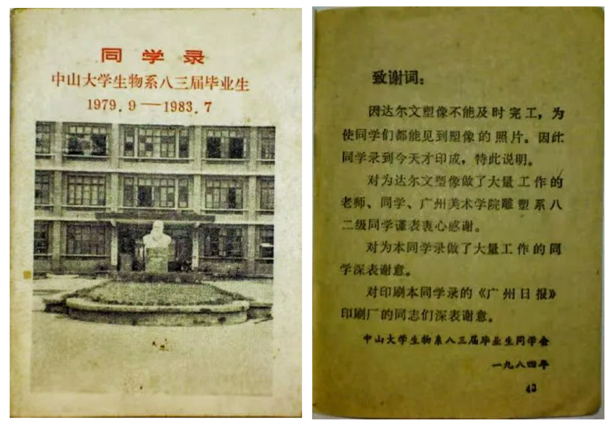 (下称美院)82级雕塑系同学共同经历的一段感人往事。在上世纪80年代,中大的毕业生多数选择种树作为母校的纪念,而79级生物系校友希望找一个更具纪念意义且持久可见的纪念形式,以表达对系里4年教育和关怀的感激,他们在读期间已经生出赠送雕塑的想法,但直到毕业前,在校友们共同努力和机缘巧合下,达尔文像的制作才得以实现。