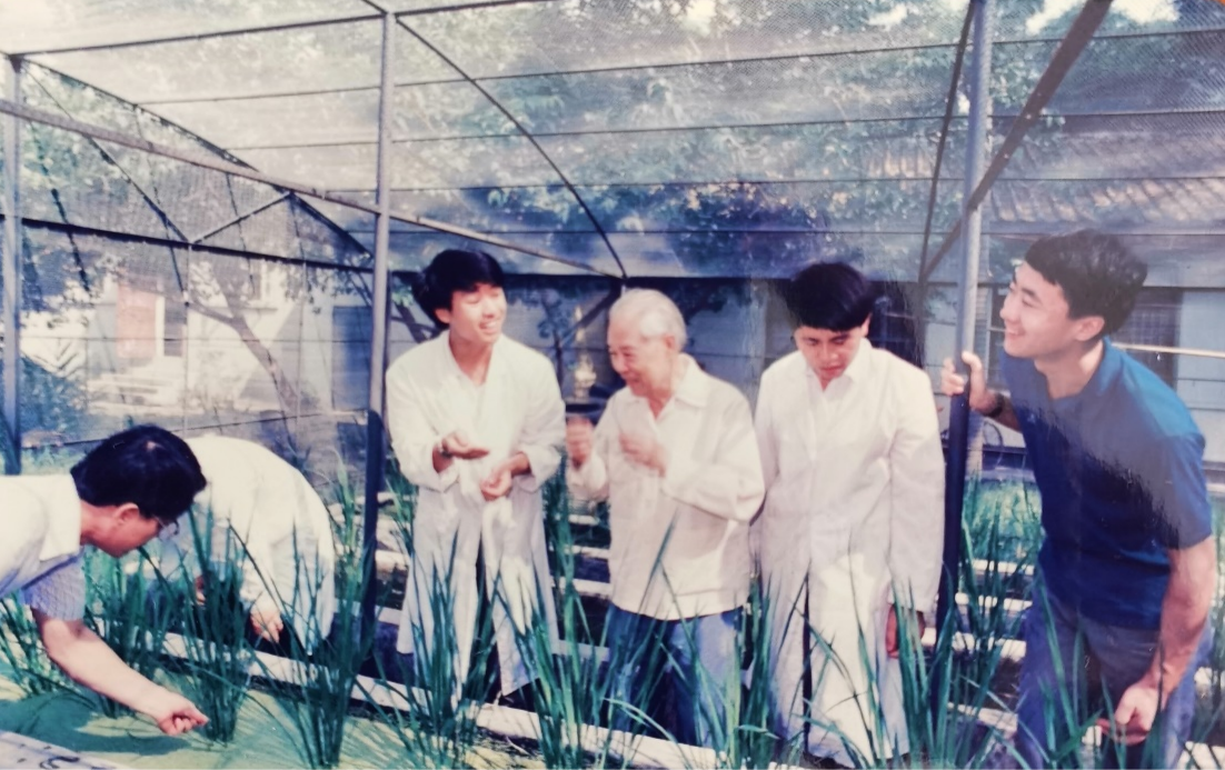 蒲蛰龙先生与学生在网室观察水稻害虫发生情况