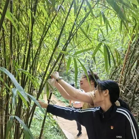 紧接着,教职工党支部的老师们引领学生支部成员步入幽静的竹园,开展竹种挂牌活动。在这个过程中,大家对中大竹园丰富多样的竹种有了更为深入的认知。这座竹园不仅是国内种类最为丰富的竹种标本园之一,更珍藏着我国数量最多的竹类活体模式标本,为早期的华南植物园竹园提供了近半数的竹种资源。除了竹子外,本竹园也零星种植有其他珍贵的植物,如国家一级保护植物猪血木(Euryodendron excelsum,山茶科),该植物由是中国近代植物分类学的开拓者和奠基人之一的陈焕镛院士亲自引入种植的。另外还有中山大学校园里仅有的焕镛木(Woonyoungia septentrionalis,木兰科)、大叶木莲(Manglietia megphylla,木兰科)、鹅掌楸(Liriodendron chinense,木兰科)、大花第伦桃(Dillenia turbinata,第伦桃科)、锡兰杜英(Elaeocarpus serratus,杜英科)、大叶藤黄(Garcinia xanthochymus,藤黄科)、越南抱茎茶(Camellia amplexicaulis,山茶科)、红果糙皮茶(Camellia crapnelliana,山茶科)、小叶买麻藤(Gnetum parvifolium,买麻藤科)等。