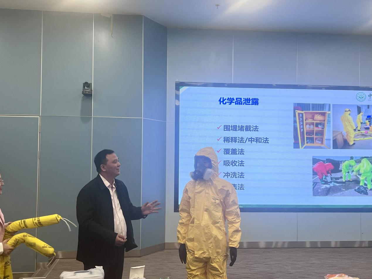 理论培训结束后,化学品安全应急演练正式启动。肖小华教授围绕化学品小规模泄漏、溢洒等典型突发场景,先详细讲解应急柜内防护手套、护目镜、吸附棉、中和剂等各类物品的适用场景与操作方法,再模拟真实事故发生后的应急响应流程,从“风险预判—隔离警戒—个人防护—现场处置”逐步演示规范步骤。