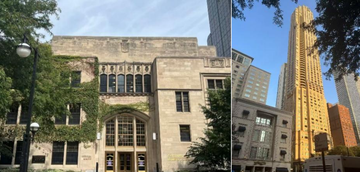 等位于较为芝加哥繁华的地带(图11),本部则较之更加偏僻,但规模较大,古典、现代风格的建筑兼而有之(图12)。当日正值其新生入学之际,校内景象十分热闹。