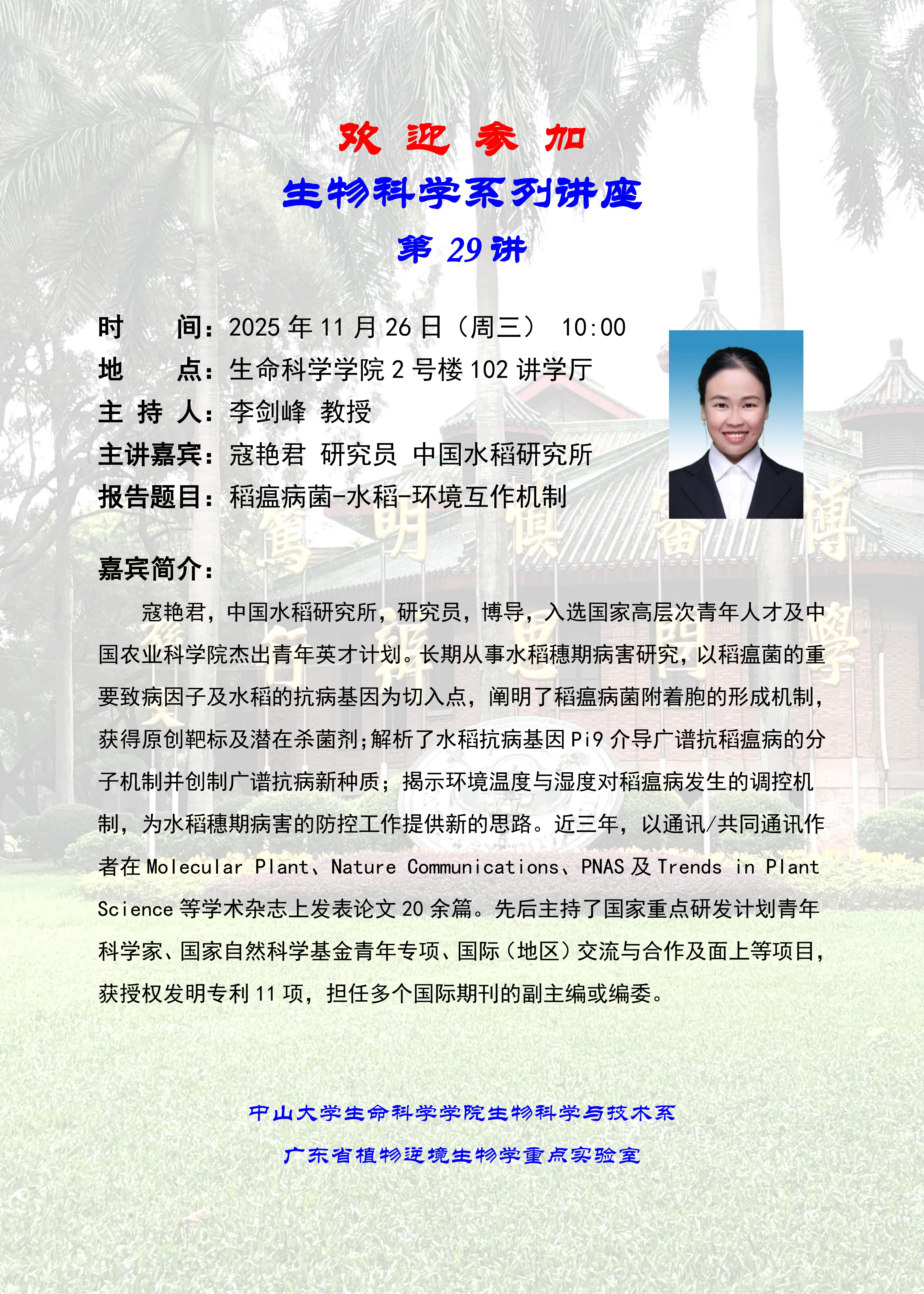 2025年11月26日生物科学系列讲座:稻瘟病菌-水稻-环境互作机制
