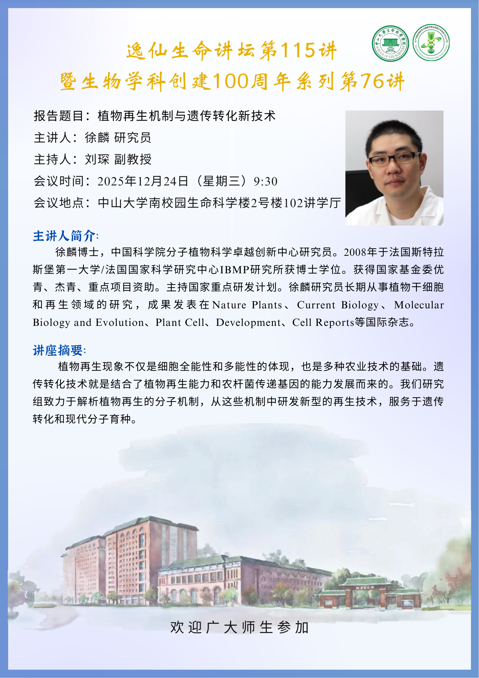 2025年12月24日世博娱乐(中国)官方网站 逸仙生命讲坛第115讲:植物再生机制与遗传转化新技术