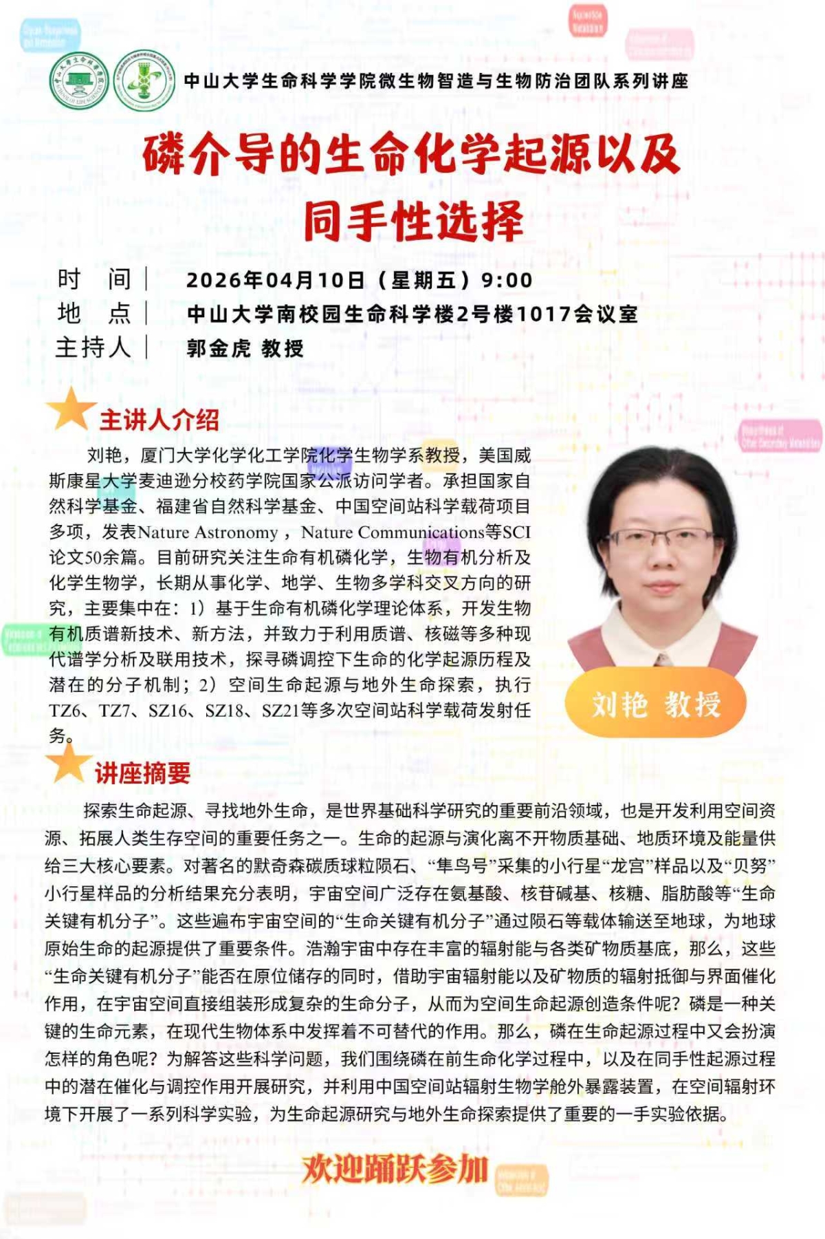 2026年4月10日微生物智造与生物防治团队系列讲座:磷介导的生命化学起源以及同手性选择