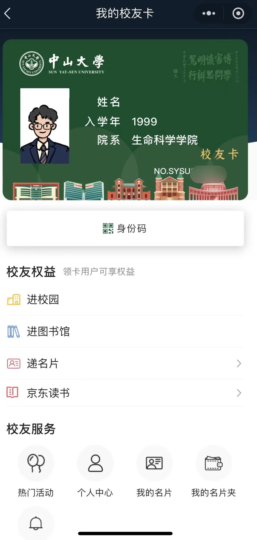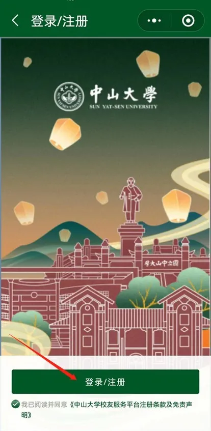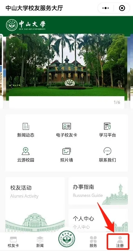 只需轻轻一点,打开“中大校友”微信小程序,注册中山大学校友服务平台,您即可申领电子校友卡(办理流程详见下文指引)。