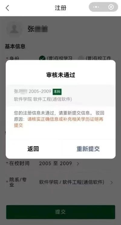 如填写信息及资料不正确,校友卡申请信息被驳回,系统提示“审核未通过”,请按提示信息修改或补充材料后,点击“重新提交”。
