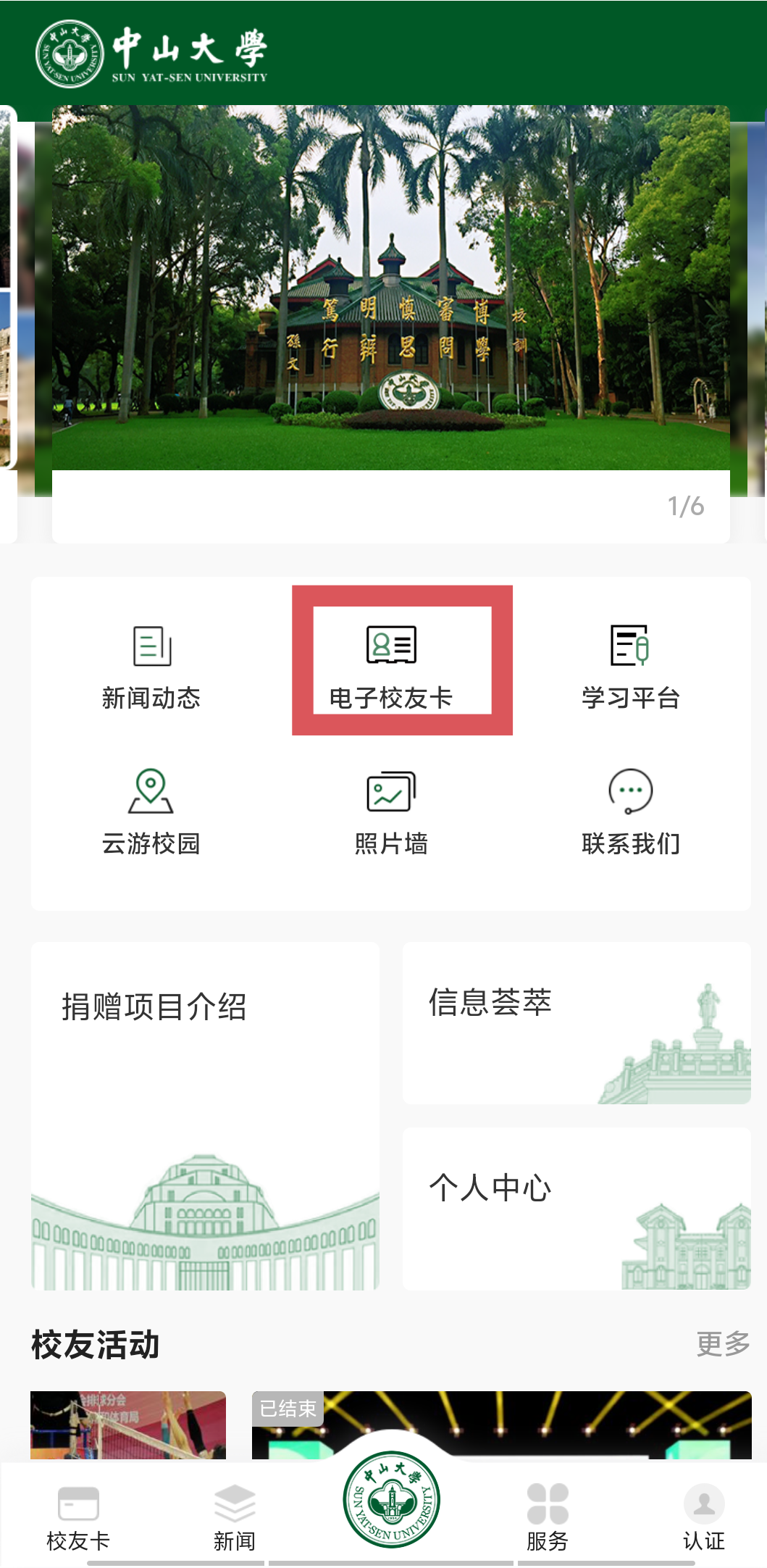 通过“中大校友”小程序可以轻松使用认证校友身份、办理校友卡、参加校友活动等一系列功能,与全球中大人云端相聚,共叙往日情谊。