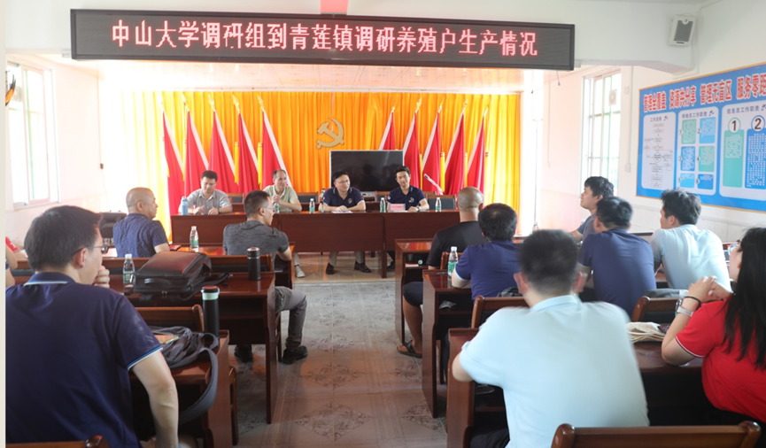 当天下午,莫德林教授一行包括三位动物学博士生党员首先来到清远市阳山县青莲镇与当地村镇领导和养殖户进行座谈交流。会上,当地村镇领导对中山大学考察帮扶组的到来表示热烈欢迎,并对当地养殖情况进行了介绍。支部书记莫德林教授介绍了此行的目的和支部人员组成情况,随后各位支委以及党员与养殖户们进行了互动交流,耐心解答了有关“鱼为什么长得慢”“小牛在什么情况下会拉稀”“安格斯牛不带仔”“仔猪体弱多病有什么办法改善”等具体实践问题。同时,为帮助养殖户们解决今后可能出现新的问题,支部建立了清远养殖户问题咨询平台,该平台沟通专业人士和养殖户,使养殖户随时可以获取解决问题的办法。