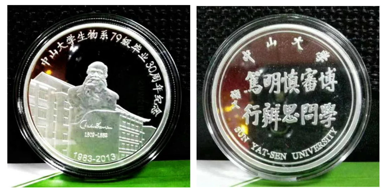 图为生物系79级毕业30周年纪念银币正反面,由林向阳校友提供