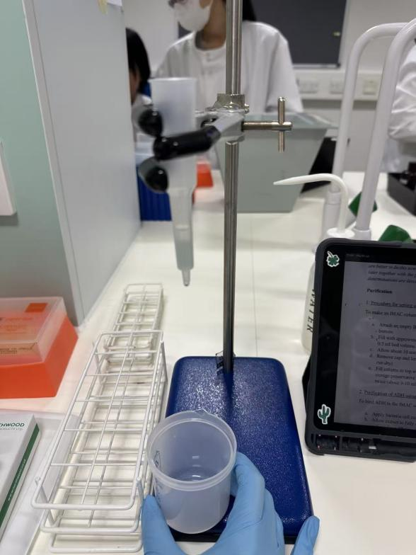 破冰活动的第二天,我的暑校学习生活正式开启,每一周都有不同的学习主题,第一周我们在教授的带领下学习如何通过患者患病信息绘制遗传图谱,并根据家族遗传图谱及等位基因长度分析来判断疾病的基因遗传特性。我在老师的指导下对如何通过设计实验逐步验证某个基因突变是否为引起疾病的原因的过程有了更清晰的梳理和认识,这次训练不仅提升了我的实验设计的整体思维,也使我首次接触到BLAST、UCSC genome browser、PolyPhen等网站。第二周我们回顾了生化课程中的酶动力学方程,并以酵母的乙醇脱氢酶(Alcohol Dehydrogenase,ADH)为材料进行实验技术学习。通过这周的学习,我对米氏方程中各种参数的测定及非线性米氏方程图的绘制有了更深的认识,对其中涉及的实验技术也有了更好的掌握。第三周的学习主要聚焦于第二周ADH酶纯化效果的分析上,主要训练的是SDS-PAGE凝胶电泳和Western Blot实验技术。在SDS-PAGE实验中,通过比对菌液、实验提纯ADH的最好样本和纯ADH的条带,我们可以判断ADH提纯的效果。在Western Blot实验中,我们学习了转膜和一抗、二抗孵育技术,利用抗原与抗体特异性结合的原理,这些技术可特异性地判断提纯物中是否含ADH。这是我第一次接触转膜技术,在实验中出现的各种问题帮助我进一步思考实验中的不足。