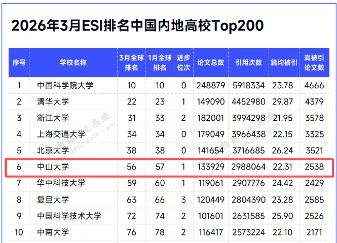与2026年1月相比,国内19所高校共新增19个前1‰学科。其中,中山大学“微生物学”学科新晋全球前1‰,学校共有14个全球前1‰学科。中山大学整体位居ESI排名中国内地高校第6位,居全球高校ESI排名第56位,全球排名较上一期提升1位。